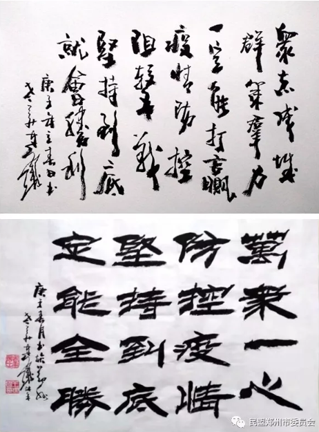 全國(guó)防控新型冠狀病毒感染肺炎疫情進(jìn)入關(guān)鍵時(shí)期,網(wǎng)絡(luò)信息復(fù)雜,在此情況下,傳播正能量、占領(lǐng)輿論高地就顯得尤為重要。民盟鄭州十一中支部借助微信群等現(xiàn)代媒體,及時(shí)傳播官方疫情信息,消滅了謠言可能產(chǎn)生的溫床;及時(shí)推送疫情防控知識(shí),幫助廣大盟員提高防控能力。書法家王建國(guó)老師心有所感,即興揮毫潑墨,鼓舞士氣,傳播正能量:鐘公大義耄耋年,南上江城抗肺炎。山崩地裂無(wú)所懼,拯救生靈義薄天。