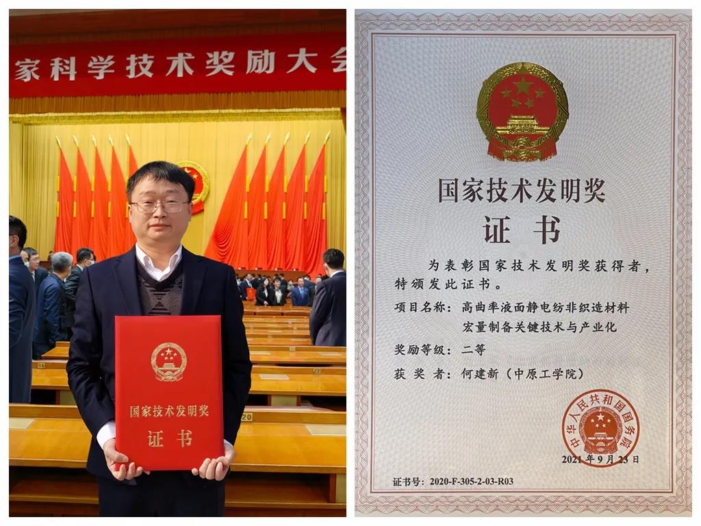 何建新,博士,教授,博士生導(dǎo)師,1977年10月生。河南省青年科技獎(jiǎng)獲得者,入選河南省學(xué)術(shù)技術(shù)帶頭人、河南省科技創(chuàng)新人才和河南省高??萍紕?chuàng)新人才計(jì)劃,現(xiàn)任中原工學(xué)院紡織服裝產(chǎn)業(yè)研究院常務(wù)副院長(zhǎng),民盟鄭州市委會(huì)委員、民盟中原工學(xué)院總支部主委。11月3日,2020年度國(guó)家科學(xué)技術(shù)獎(jiǎng)勵(lì)大會(huì)在北京人民大會(huì)堂舉行。何建新負(fù)責(zé)的“高曲率液面靜電紡非織造材料宏量制備關(guān)鍵技術(shù)與產(chǎn)業(yè)化”科研成果獲得2020年度國(guó)家科學(xué)技術(shù)發(fā)明二等獎(jiǎng)。該項(xiàng)技術(shù)攻克了窄分布微納米纖維產(chǎn)業(yè)化中的關(guān)鍵技術(shù)難題,開發(fā)了具有自主知識(shí)產(chǎn)權(quán)的產(chǎn)業(yè)化系列裝備,實(shí)現(xiàn)了微納米纖維的大規(guī)模、長(zhǎng)時(shí)效、穩(wěn)定性生產(chǎn),為高附加值功能性微納米非織造材料產(chǎn)業(yè)化提供了解決方案,推動(dòng)了我國(guó)高性能非織造材料的突破性進(jìn)展。何建新教授團(tuán)隊(duì)長(zhǎng)期致力超細(xì)纖維成形理論、裝備及功能紡織材料研究。圍繞超細(xì)纖維紡絲技術(shù)及裝備、可降解口罩、空氣過濾材料、油水分離膜、電子皮膚構(gòu)建等開展了系統(tǒng)的研究工作。團(tuán)隊(duì)先后承擔(dān)國(guó)家自然科學(xué)基金項(xiàng)目7項(xiàng),國(guó)家重點(diǎn)研發(fā)計(jì)劃子課題1項(xiàng),獲國(guó)家技術(shù)發(fā)明獎(jiǎng)1項(xiàng),省部級(jí)科技成果一等獎(jiǎng)1項(xiàng),二等獎(jiǎng)2項(xiàng),授權(quán)發(fā)明專利30項(xiàng)。新冠疫情爆發(fā)后,團(tuán)隊(duì)自主研發(fā)的納米纖維防護(hù)口罩濾材及成套裝備在江西、河南和浙江等地企業(yè)落地,為疫情防控作出了貢獻(xiàn)。